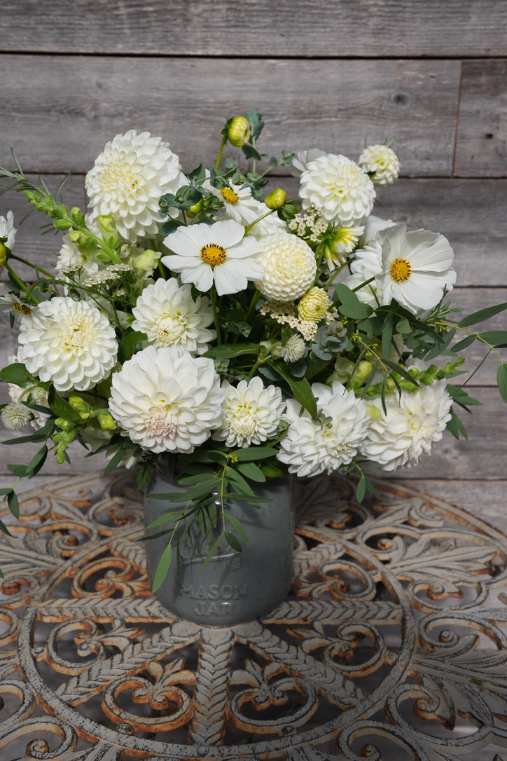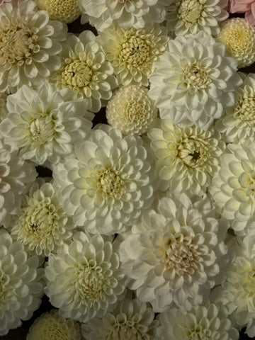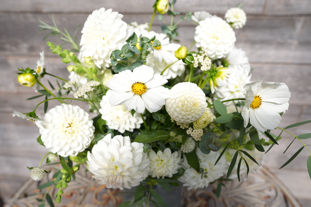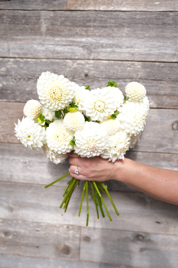 White Wedding is a timeless, elegant dahlia collection. With a mix of white, ivory, and creamy hues, this collection creates a look that feels classic yet elevated. Perfect for romantic and versatile arrangements.