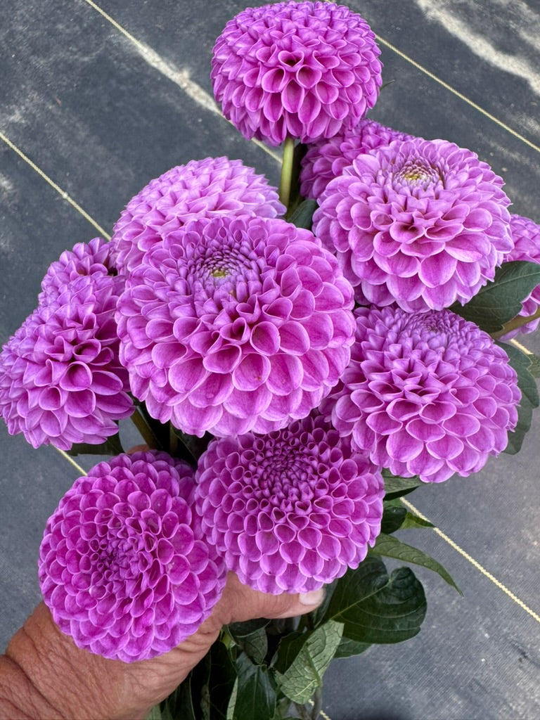 Frank Holmes is a purple bloom with back petals fading to a light lavender as the bloom ages. Excellent stems for cutting. This is one of the sweetest little dahlias and the variety produces armloads of flowers.