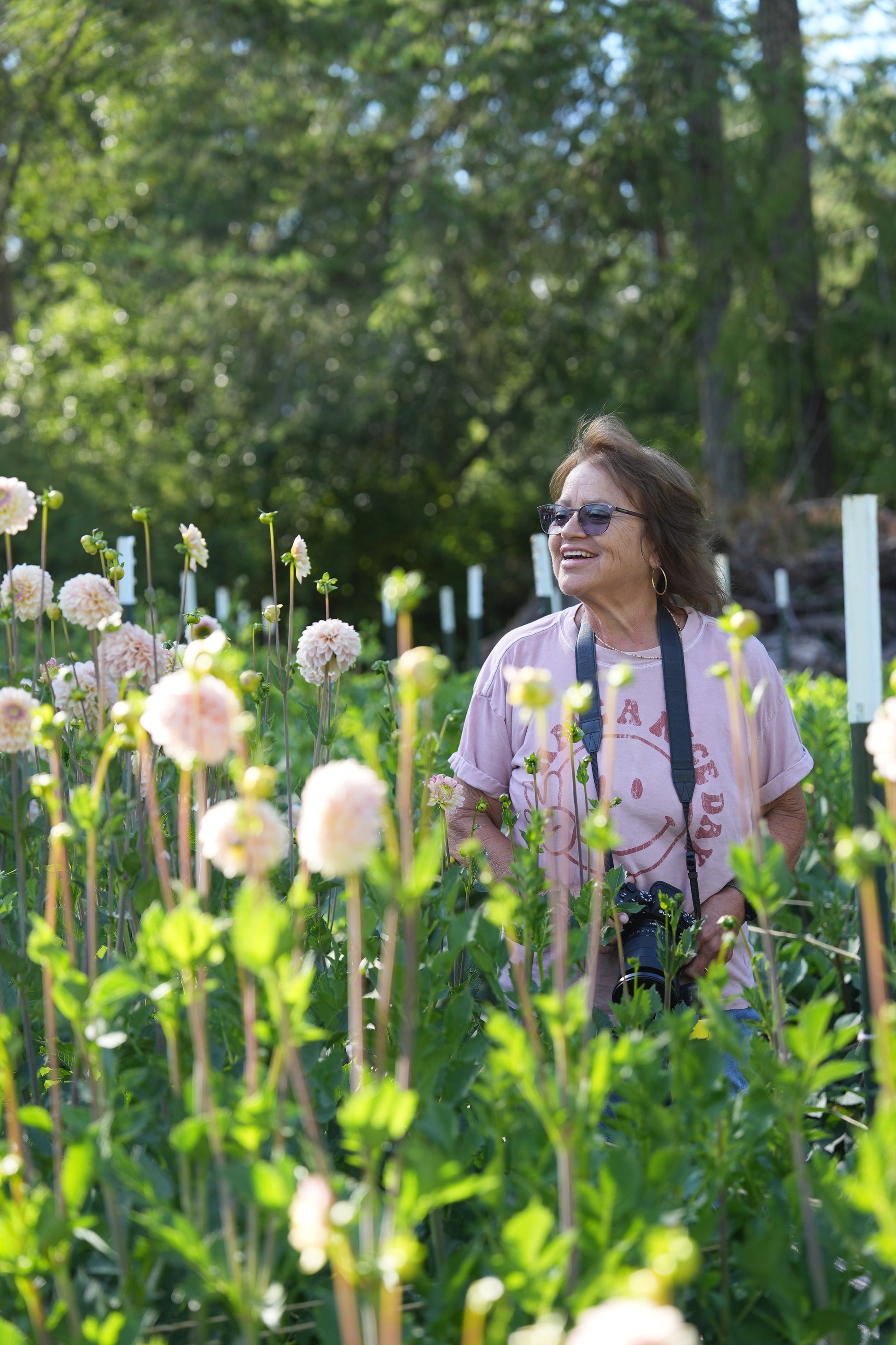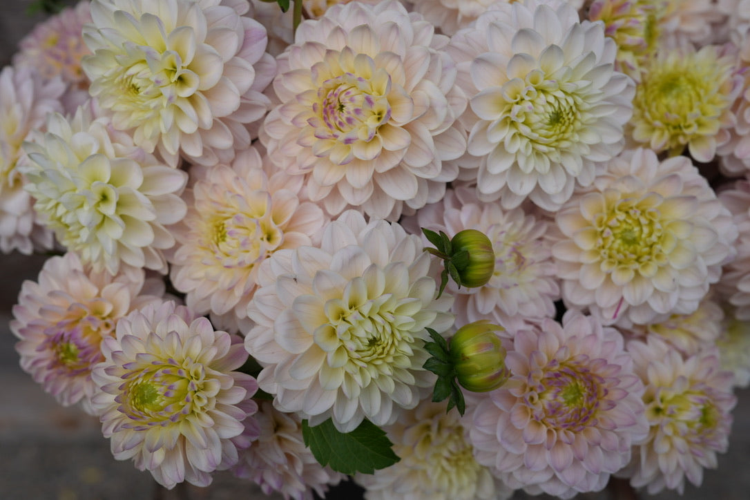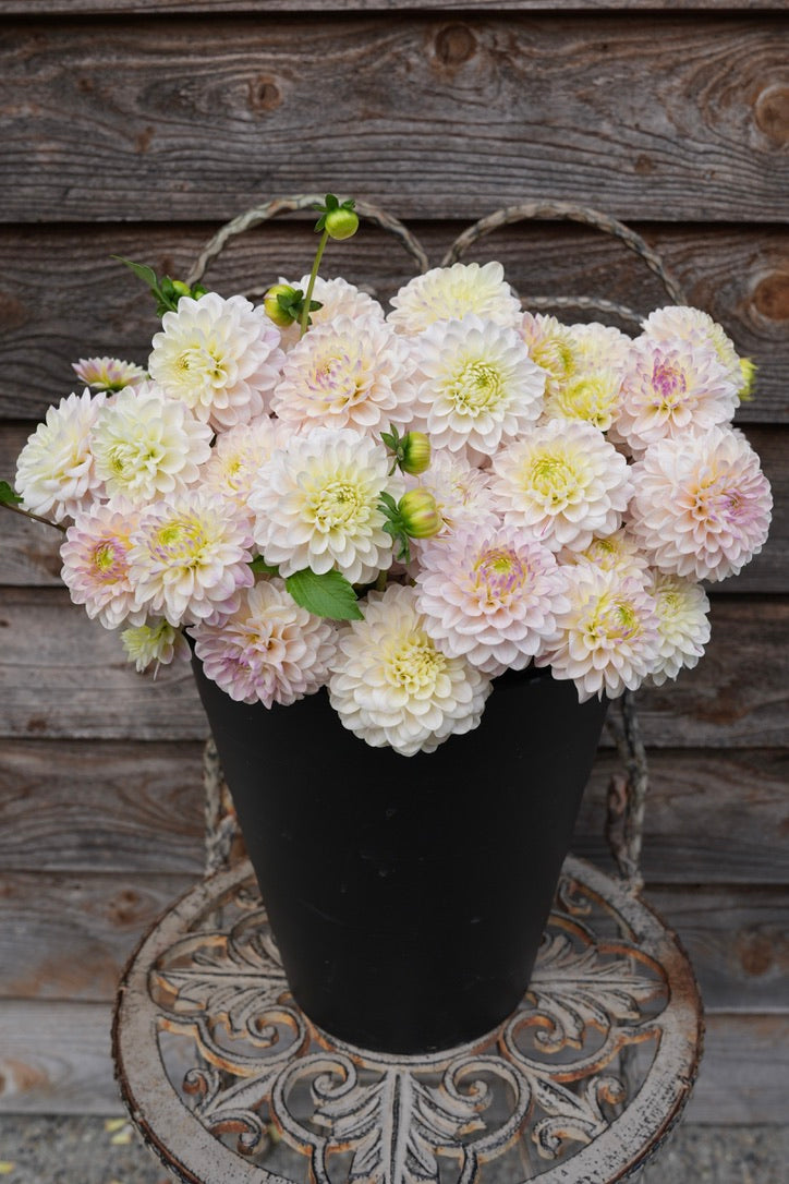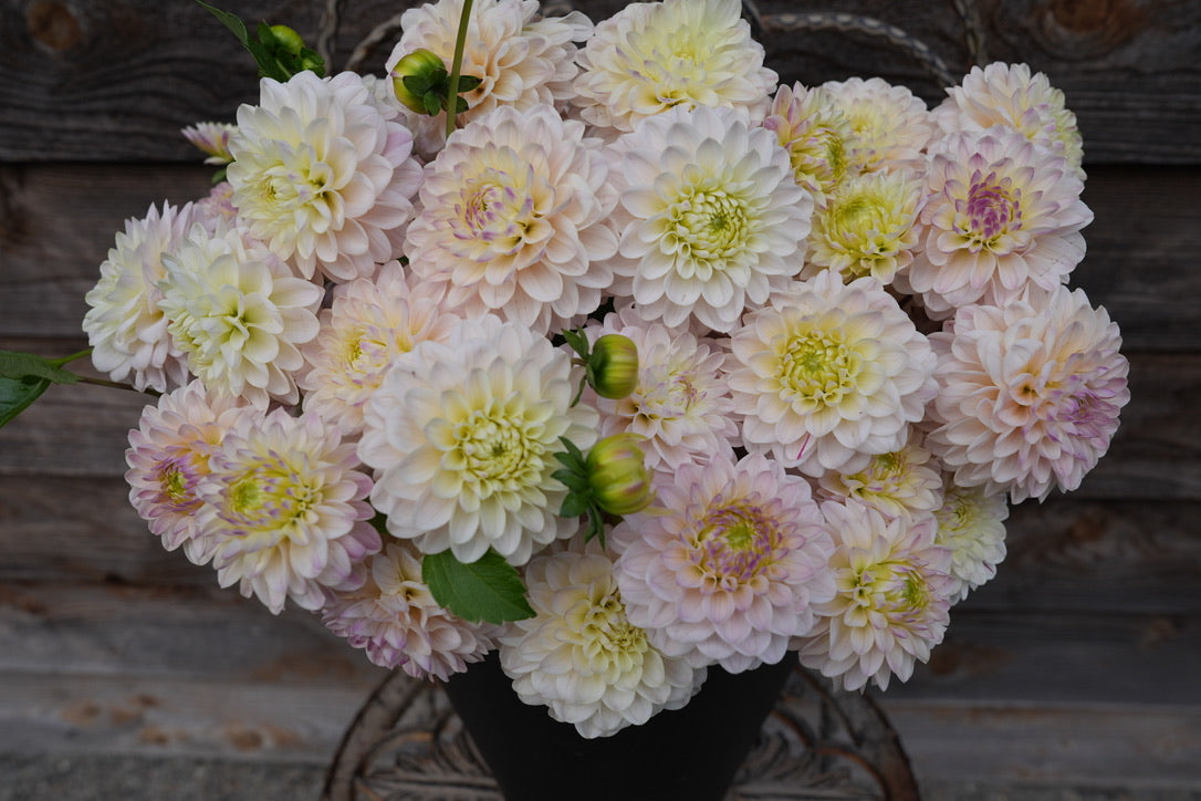 RM Karoline is a gorgeous flower that showcases soft pink and a touch of yellow hues. Named after yours truly, her long, dark stems and a height of 5.5' are taller than me! The blooms feature a green center that is more prominent in the early season, but tends to close up as the season progresses in our PNW climate. She is a heavy bloomer throughout the entire season. I include these in most pastel wedding orders!