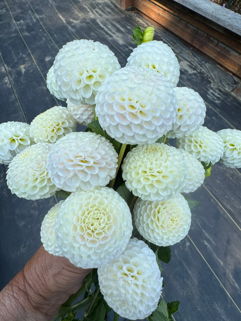 A cute creamy white dahlia with a very light dusting of pinky lavender flecks. Loved for wedding work because of size and plant produces lots of blooms all season on long stems.